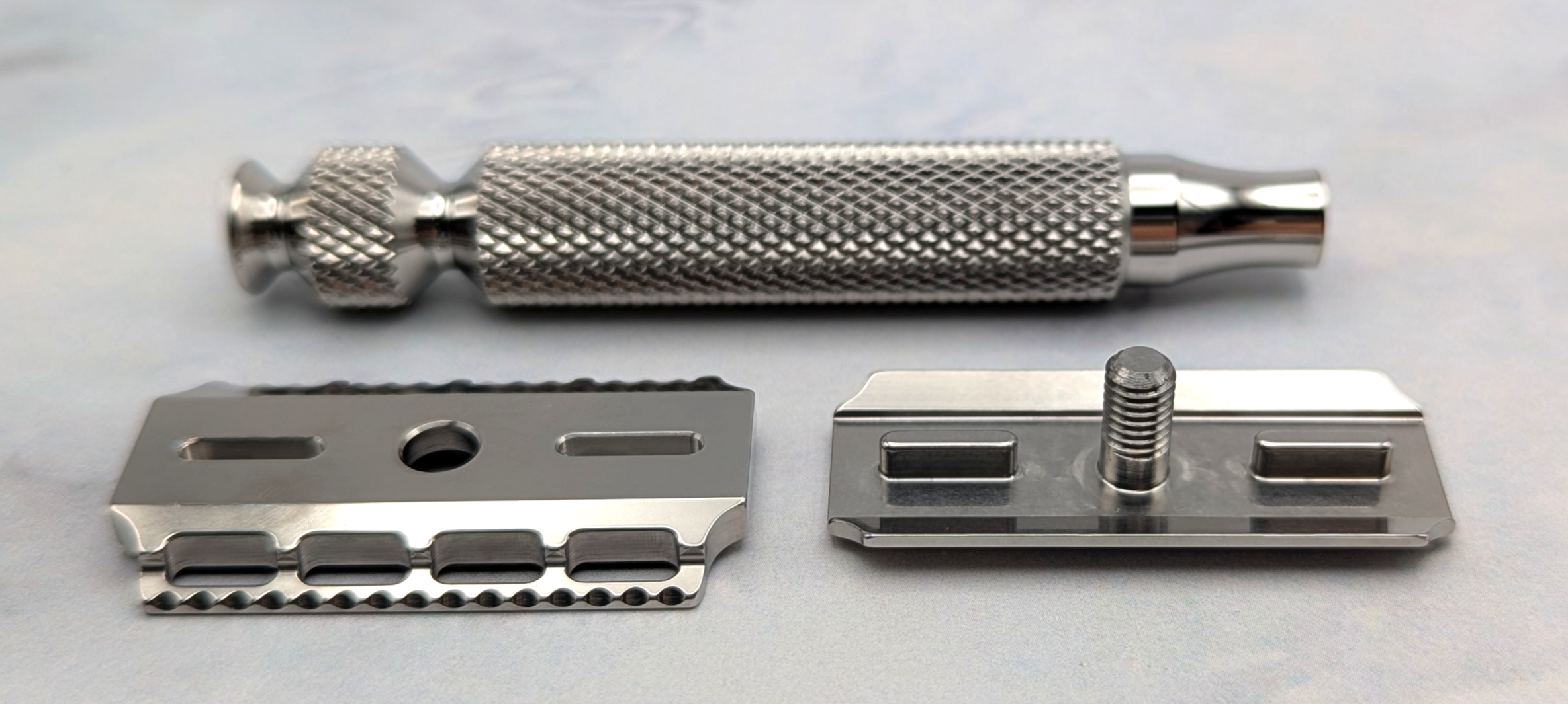 Razorockの公式ではマリングレードのステンレスをCNC掘削機で削り出していると説明があります。トップキャップのネジの根元やガイドピンの根元などが非常に美麗に削り出されています。全体的にピカピカになるまで磨かれていなのはRazorockのポリシーであり、コスト削減というのもあるのでしょう。他のステンレス製両刃カミソリ購入しやすい価格になっています。